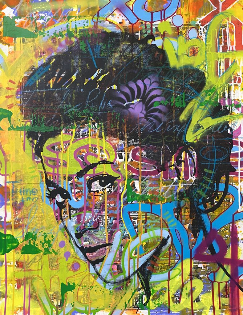 Never is a 2019 mixed media piece on Bristol board. The AURA series portrays beauty as being more than skin deep. The noise of life, and the urban environment, like life itself is never predictable, and always moving.